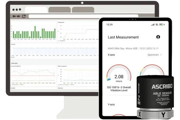 ABLE Patrol se basa en tres elementos: un sensor triaxial e inalámbrico de vibración y temperatura, el ABLE Sensor; una Tablet industrial resistente y un software profesional de análisis de vibraciones, el ABLE Analytics.